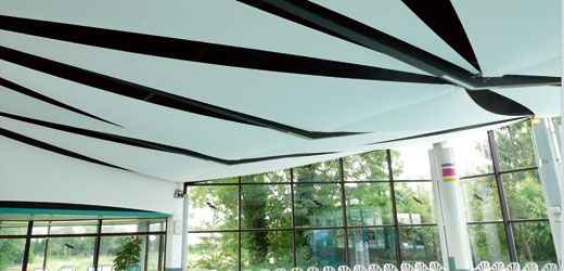 Das Akustiksegel ist nicht nur überaus effektiv, sondern auch ästhetisch sehr wirkungsvoll. Durch die besondere Stabilität des Gewebes lassen sich große, frei im Raum schwebende Segelstrukturen bilden. Akustiksegel dienen zusätzlich der Verblendung von kahlen Decken oder Wänden und als Sonnenschutz.