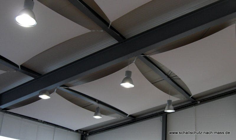 - Frei im Raum gespannte, schallabsorbierende Akustiksegel (spezielle Materialien) verbessern die Raumakustik und sehen blendend aus.